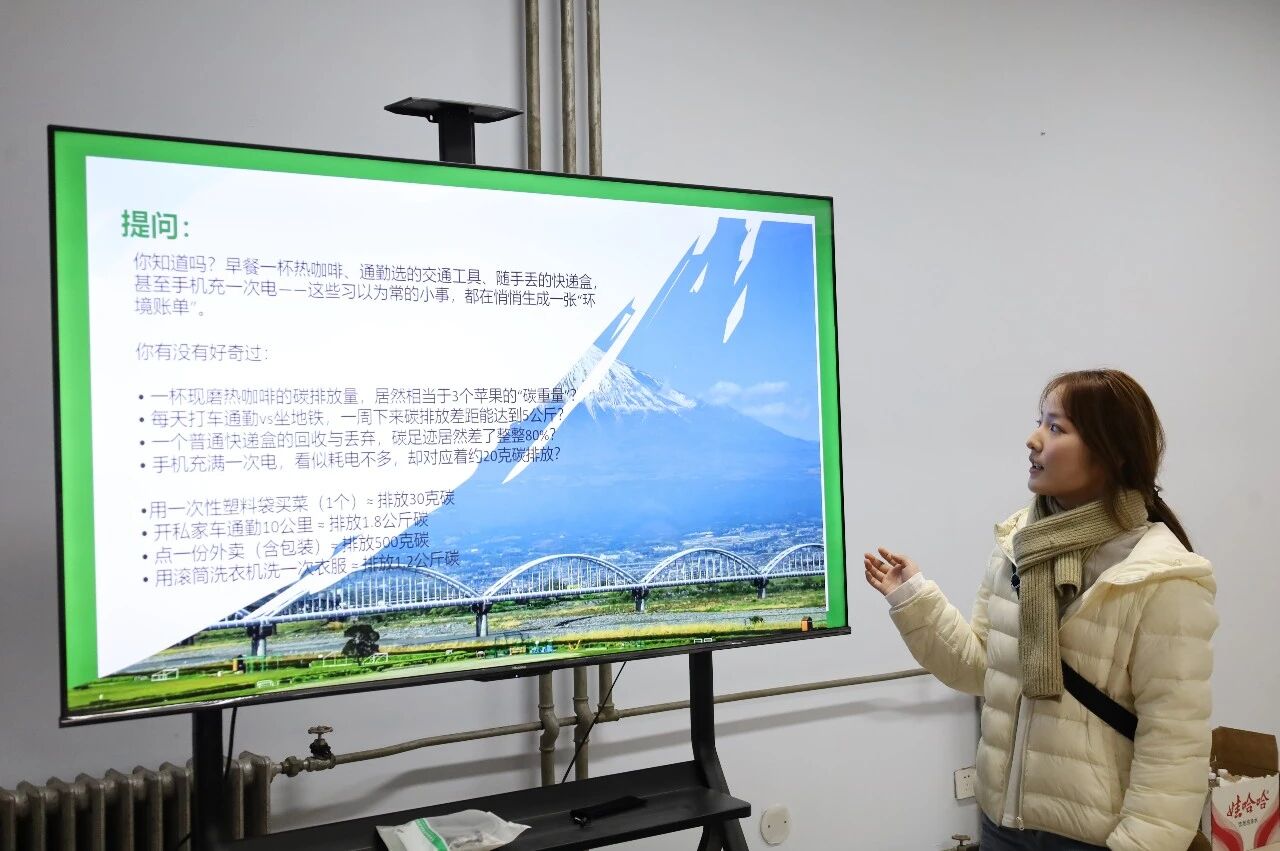 本次讲座聚焦 “碳足迹测算与日常减碳” 核心主题。通过日常场景碳排放数据引发师生关注,清晰界定碳足迹概念,还分享了高频场景碳排放系数表与 “回忆 - 计算 - 汇总” 三步测算法,为师生搭建起碳足迹测算的知识框架。