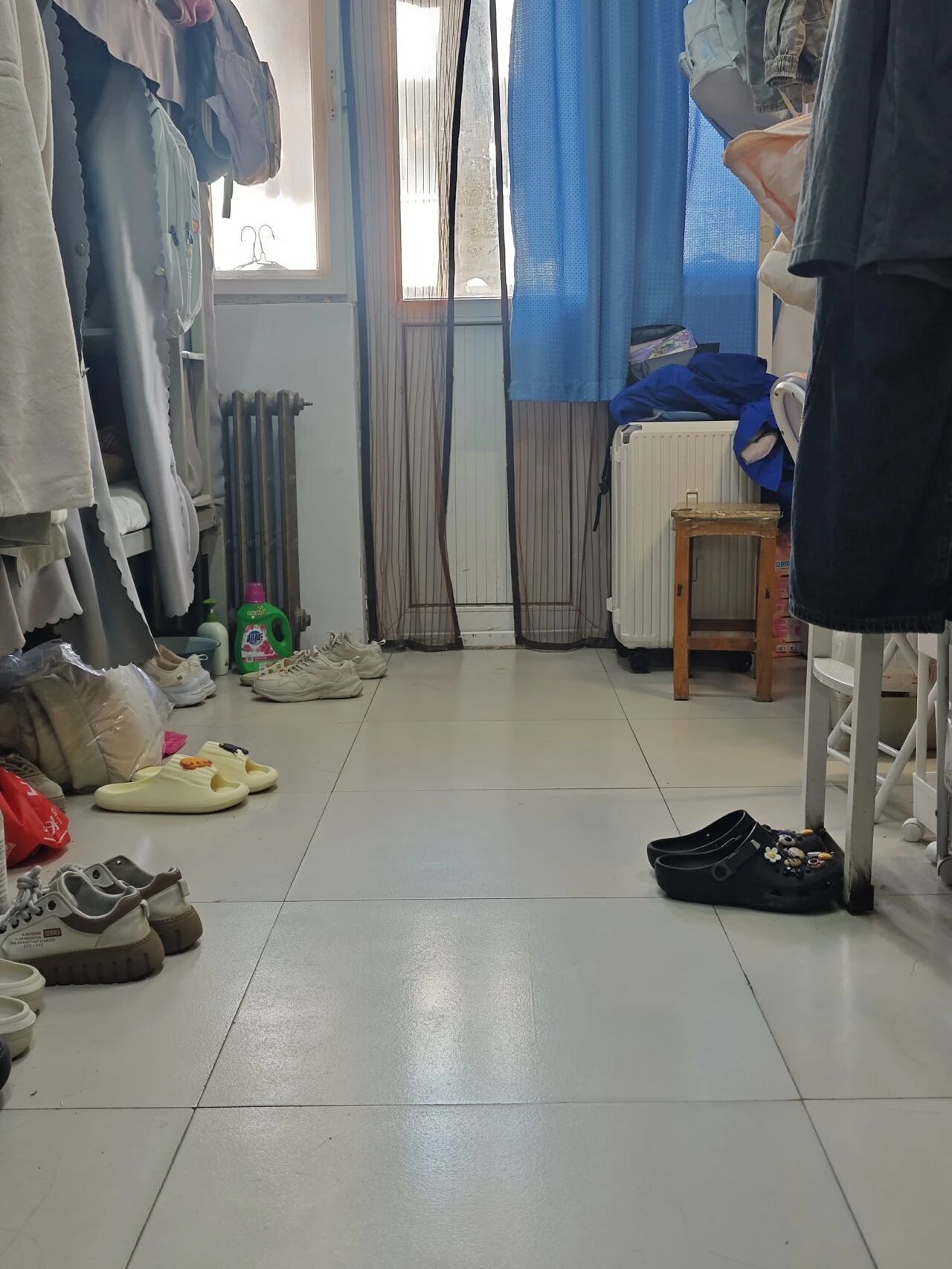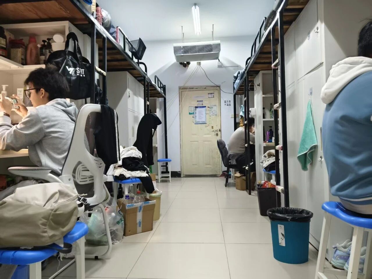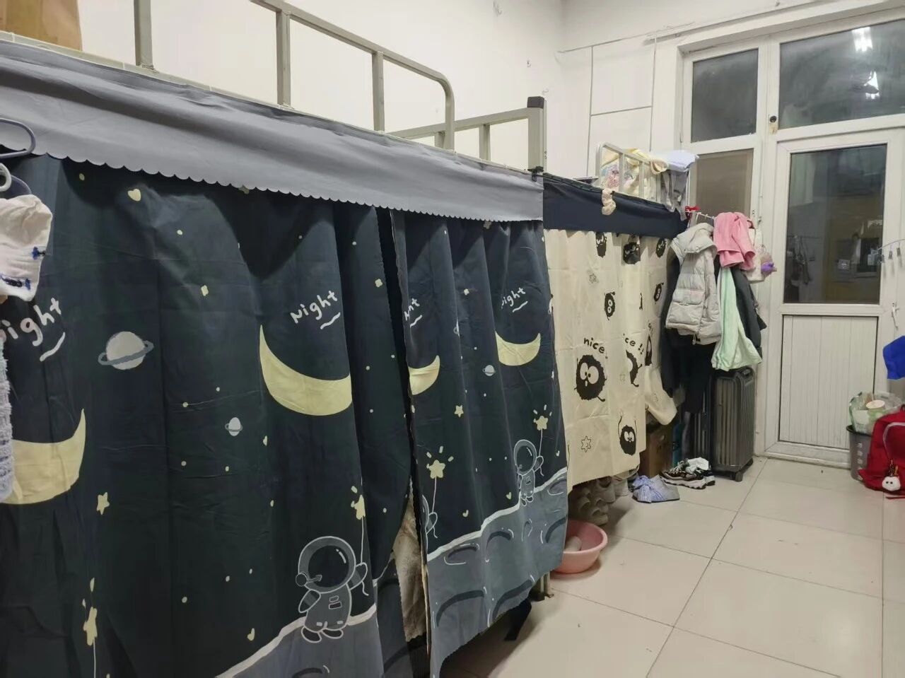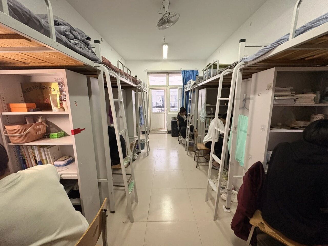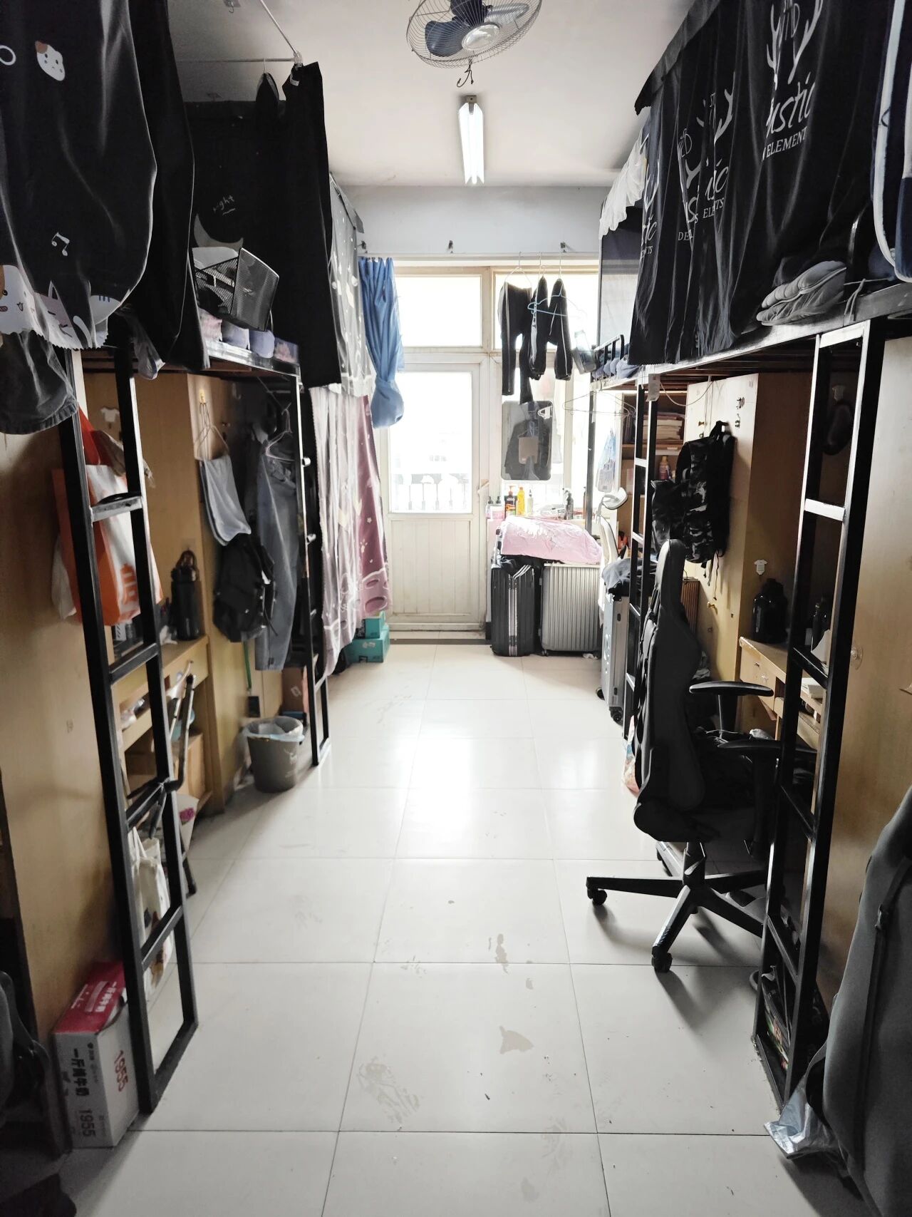 寝室是标准的六人间,每张床都配有独立的书桌和椅子,方便我们学习和存放物品。房间的布置简约而不失温馨,以白色为主色调,给人一种宁静放松的感觉。窗户很大,阳光可以尽情洒入,让室内明亮又温暖,还能欣赏到校园的美景。