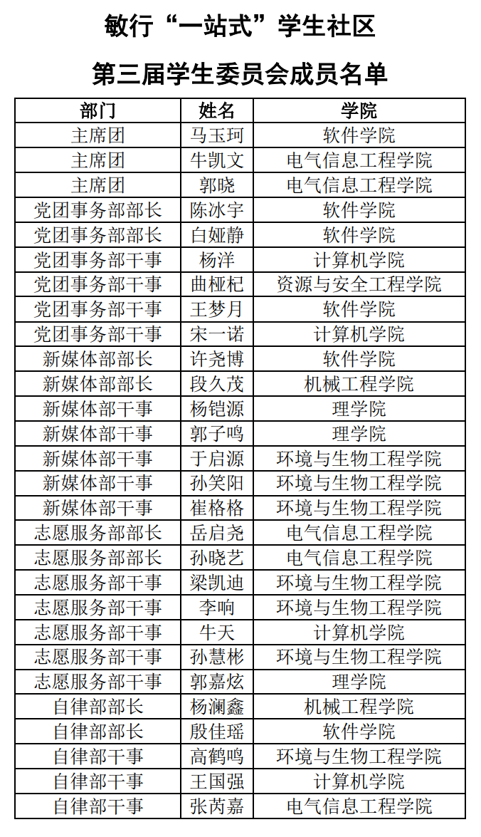 伴随着温馨的合影环节,敏行“一站式”学生社区第三届学委会换届大会圆满结束。从交接的那一刻起,责任与使命便已传承。相信在新一届学委会的努力下,在领导老师的悉心指导下,敏行“一站式”学生社区必将绽放更加耀眼的光芒!